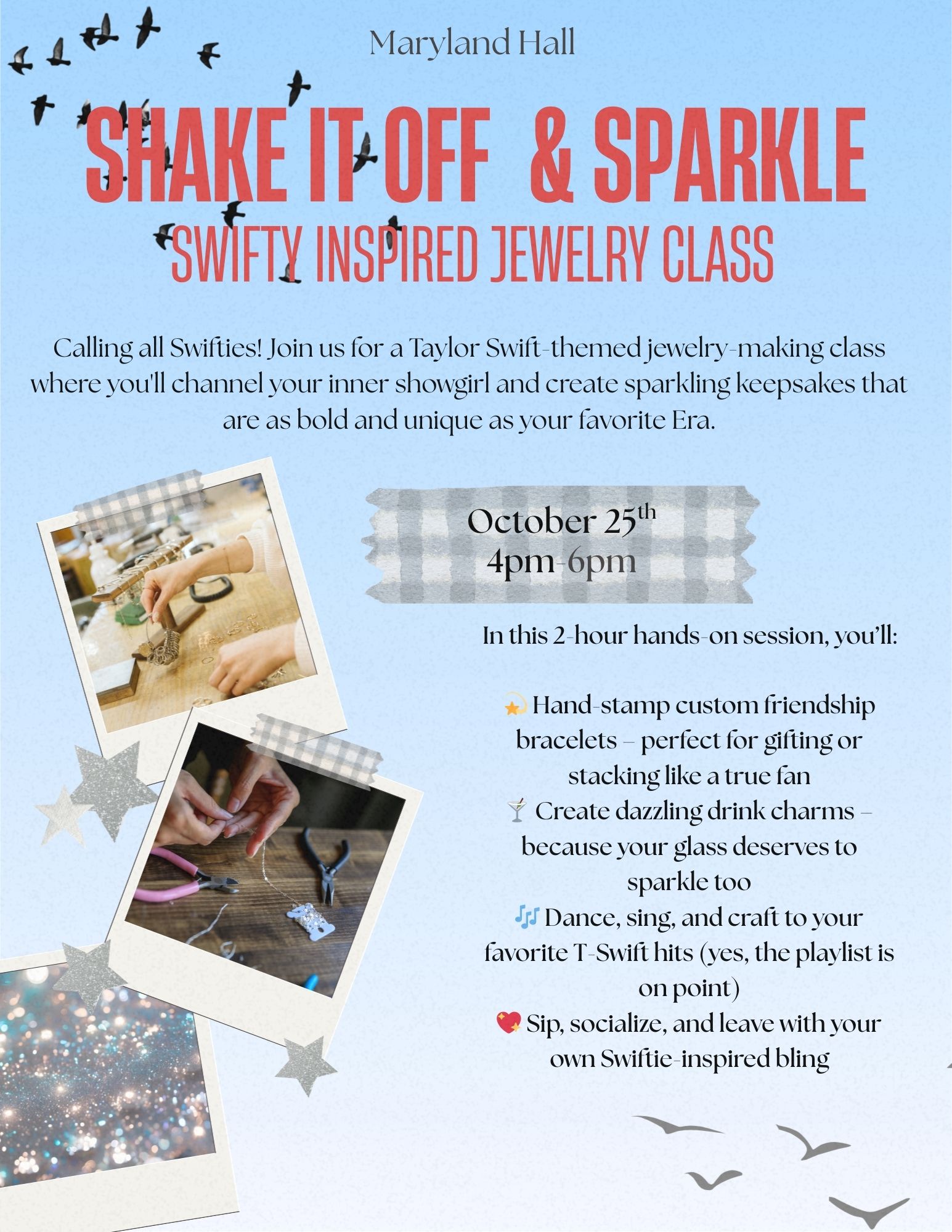 Shake it Off & Sparkle: Swifty Inspired Jewelry Class (F25JM4) Oct 25 4:00 pm - 6:00 pm Shake it Off & Sparkle: Swifty Inspired Jewelry Class (F25JM4) $88.15
