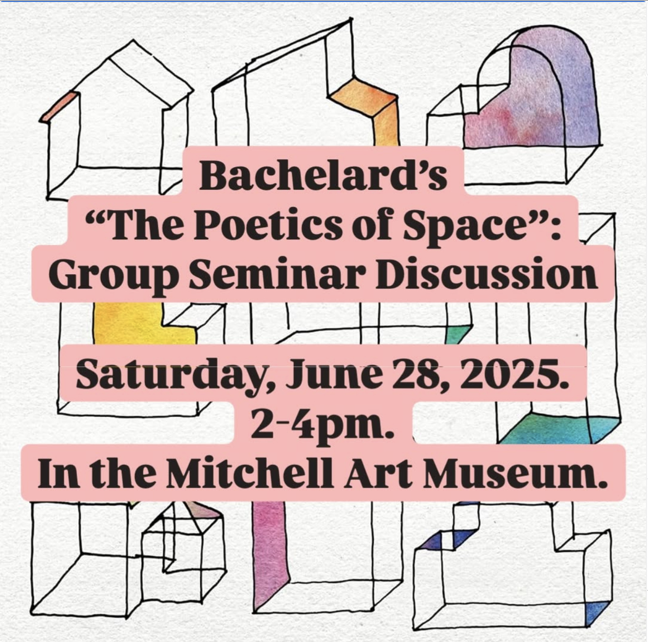 On Saturday, June 28th, from 2-4 pm, please join us in the Mitchell Art Museum as we engage in a group discussion on chapters 1 and 9 of Gaston Bachelard’s classic book, The Poetics of Space.