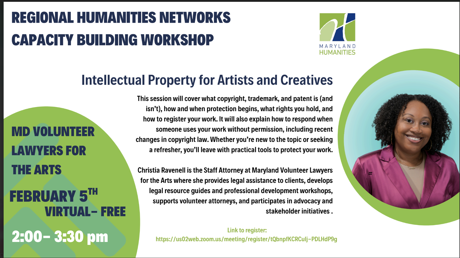 Christia Ravenell is the Staff Attorney at Maryland Volunteer Lawyers for the Arts, where she provides legal assistance to clients, develops legal resource guides and professional development workshops, supports volunteer attorneys, and participates in advocacy and stakeholder initiatives.