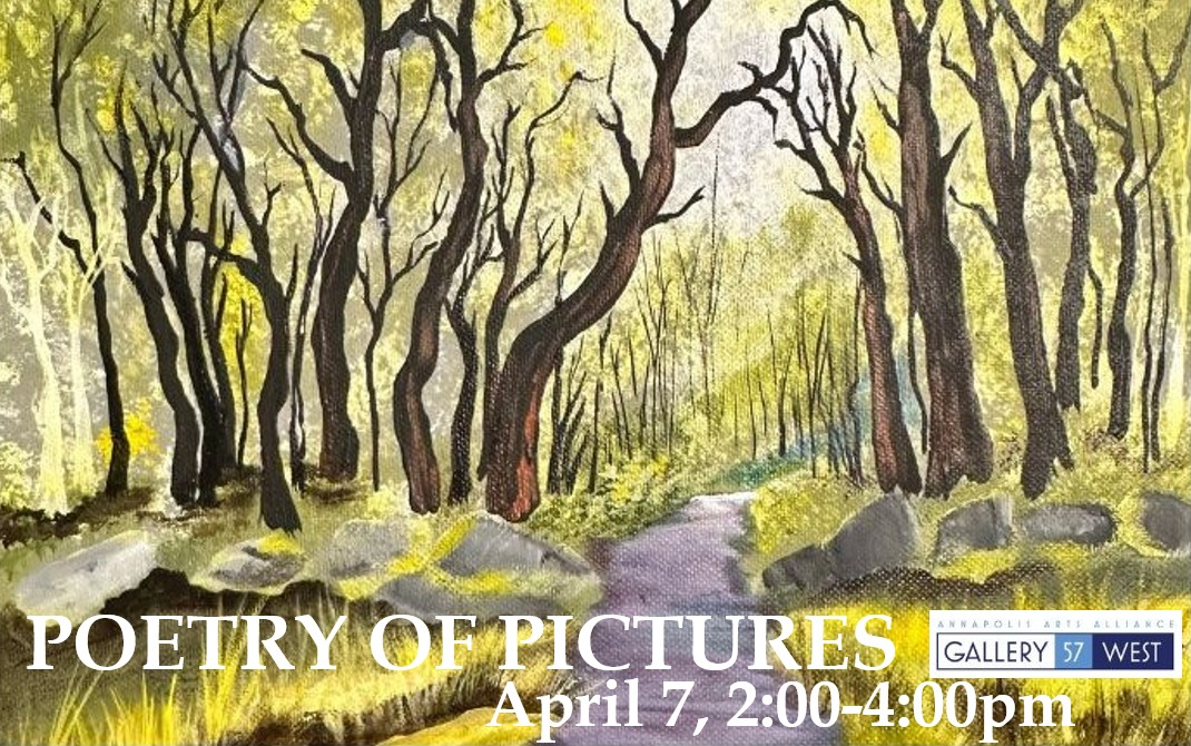 Poetry of Pictures - Open House event at Gallery 57 West on Tuesday, April 7th, 2:00-4:00 pm to celebrate poetry, visual arts, and creative dialogue, which pairs a work of art at Gallery 57 West with an inspired poem. Contact Annapolis Arts Alliance for further details at http://www.annapolisartsalliance.com